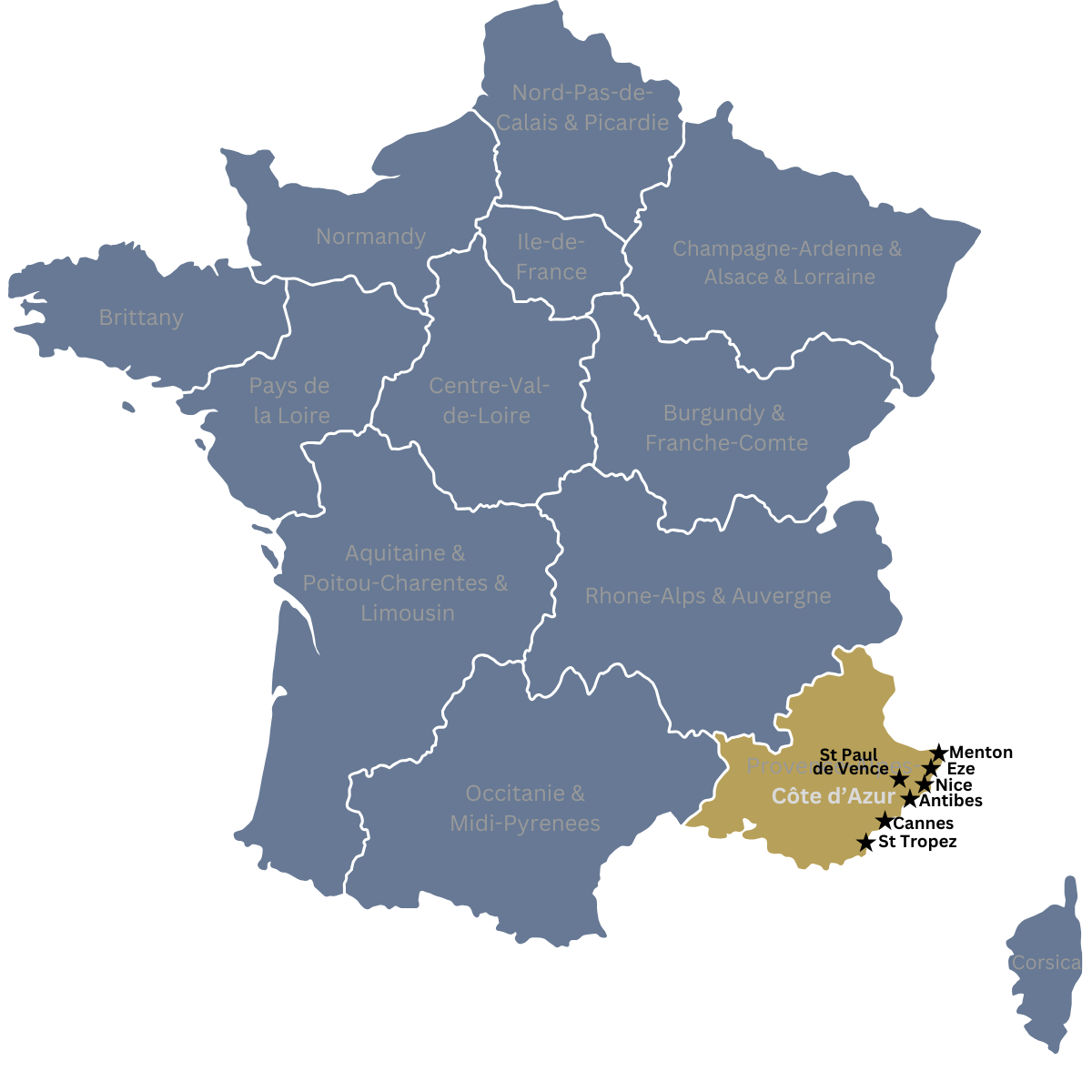 While the Cote d’Azur is technically part of the Provence-Alpes-Cote d’Azur region, we highlight it separately given its unique geography and cache! There is no official geographic boundary for the Cote d’Azur (also known as the French Riviera), but it is usually considered to be from Cassis or Toulon on the west to Menton at the France–Italy border in the east. You will find the famous Cotes de Provence rose wine in this region, the well-respected Bandol appellation with its famous reds, and Cassis, where white wine is king. While it’s best known for its glamorous resort areas, the Cote d’Azur offers many charming villages and delicious local cuisine.